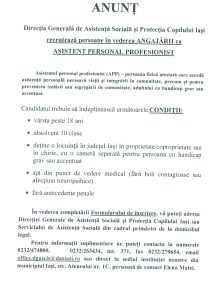 Anunț – DGASPC Iași recrutează persoane în vederea angajării ca ASISTENT PERSONAL PROFESIONIST